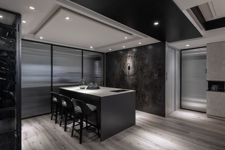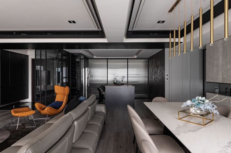 玻璃、鏡面、金屬、不鏽鋼等複合材質,搭配石材、水泥和木質等。